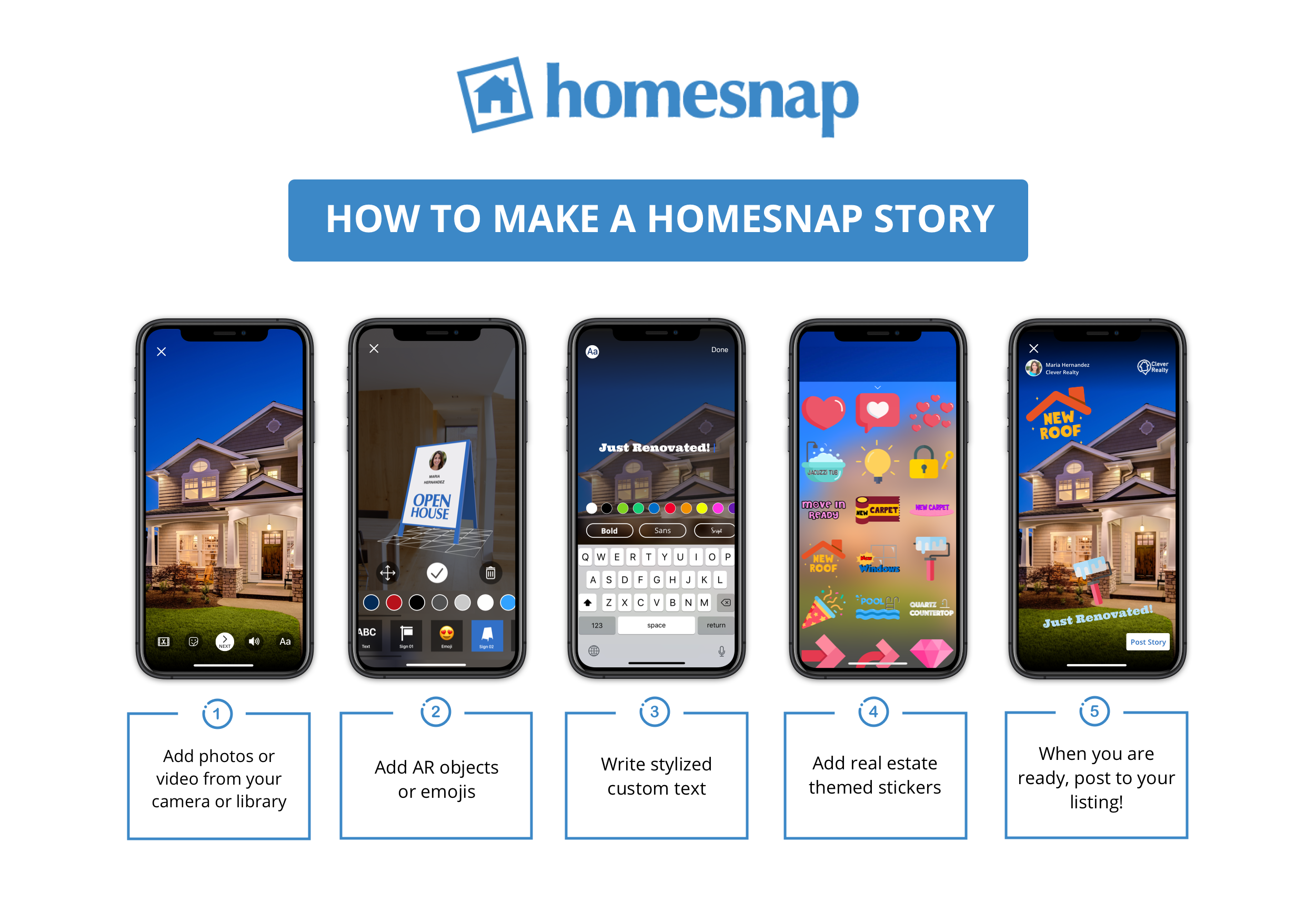 Homesnap Stories let agents connect with potential buyers in a more personalized and creative way through augmented reality (AR) objects and emojis, stylized custom text, music, real estate-themed stickers, and more. Additionally, agents can track who is engaging with their content and how often, as well as seamlessly share their Homesnap Stories across their personal social media accounts.